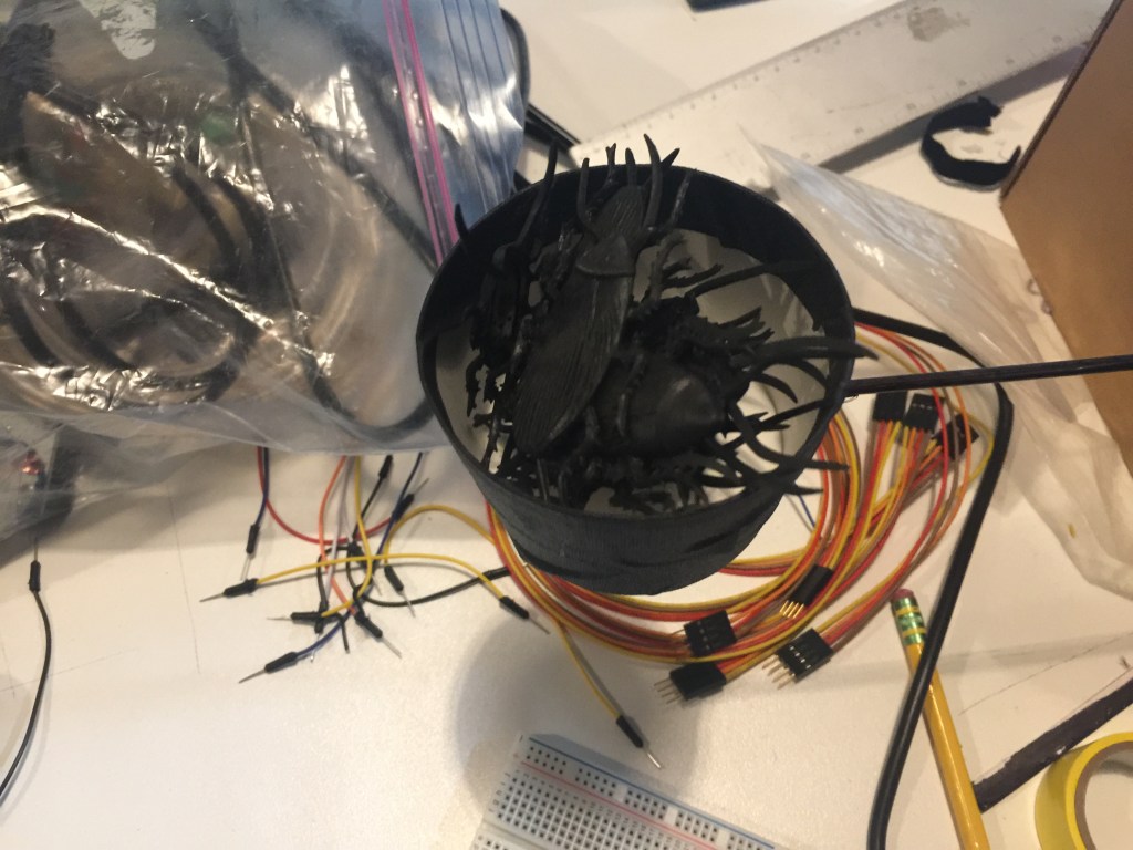 IDEA: Mary and I made a witch’s cauldron that acted as a kinetic prop for a small skit about teaching the room how to cast a spell. We wanted it to be a little goofy so we used cups on sticks, connected to sensors to plunk the ingredients into the cauldron. We had some loop issues as a result of delays accumulating to create strange timing issues. In retrospect it would have been better to treat this as a state machine and control each action in sequence, particularly because we would preform it the same way each time we acted out the skit.