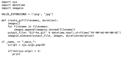 This was not as simple as we expected. After many hours of trying to get avconv to work, we switched to another media making library. ffmpeg had its issues as well. We spent the next day wading through forums, trying to find a command that would create the gif. Here are a couple of our attempts. They seem simple but neither of us are proficient at python so each took a very long time – between 2 – 5 hours of finessing.